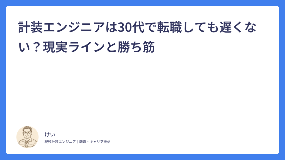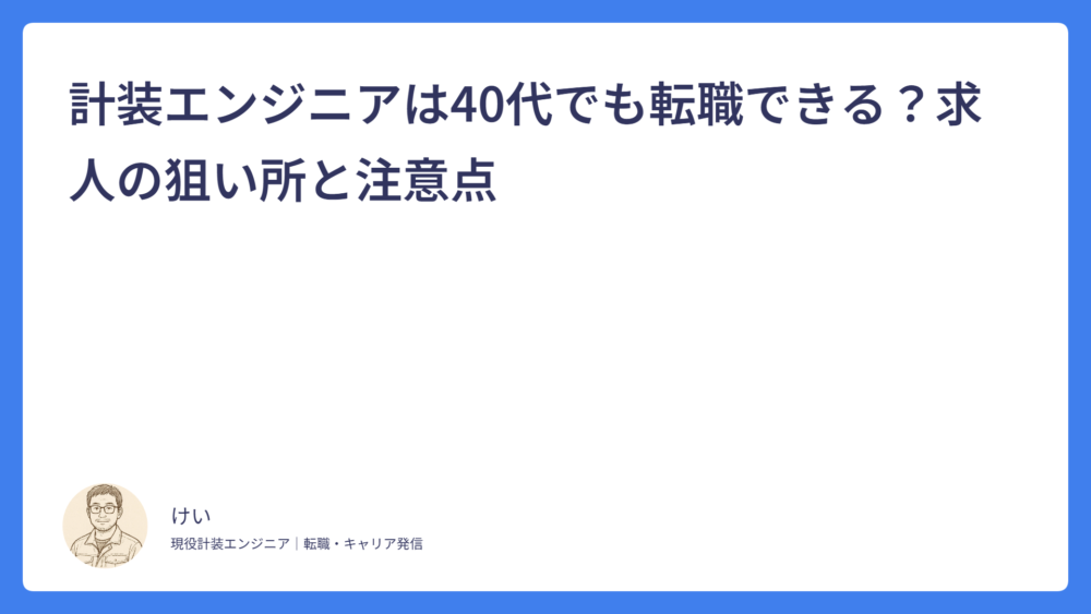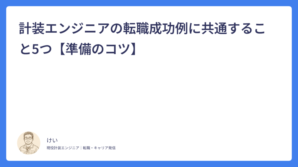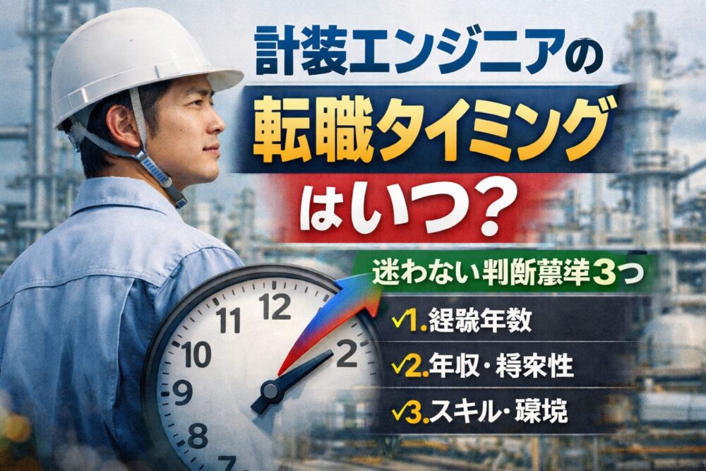 計装エンジニアは40代でも転職できる?求人の狙い所と注意点 2026.02.21 計装エンジニアの転職 けい 計装エンジニアの転職・キャリア情報|ケイソーエンジン 計装エンジニアは30代で転職しても遅くない?現実ラインと勝ち筋 2026.02.19 計装エンジニアの転職 けい 計装エンジニアの転職・キャリア情報|ケイソーエンジン 計装エンジニアの転職でよくある失敗例7つ【後悔しない対策】 2026.02.16 計装エンジニアの転職 けい 計装エンジニアの転職・キャリア情報|ケイソーエンジン 計装エンジニアの転職成功例に共通すること5つ【準備のコツ】 2026.02.16 計装エンジニアの転職 けい 計装エンジニアの転職・キャリア情報|ケイソーエンジン 計装エンジニアの転職タイミングはいつ?迷わない判断基準3つ 2026.02.15 計装エンジニアの転職 けい 計装エンジニアの転職・キャリア情報|ケイソーエンジン 計装エンジニアの転職で失敗しない方法|後悔しないための考え方と実践ポイント 2025.12.16 計装エンジニアの転職 けい 計装エンジニアの転職・キャリア情報|ケイソーエンジン プラント計装エンジニアの年収は?上げる方法5つ【相場・理由・具体策まで解説】 2025.12.14 計装エンジニアの年収・待遇 けい 計装エンジニアの転職・キャリア情報|ケイソーエンジン DCS・PLCの違いとキャリアへの影響 2025.12.14 計装エンジニアとは けい 計装エンジニアの転職・キャリア情報|ケイソーエンジン 計装からプラント計装設計にキャリアアップする方法 2025.12.14 計装エンジニアの転職 けい 計装エンジニアの転職・キャリア情報|ケイソーエンジン 計装エンジニアの将来性と今後なくならない理由 2025.12.14 計装エンジニアの転職 けい 計装エンジニアの転職・キャリア情報|ケイソーエンジン もっと見る
